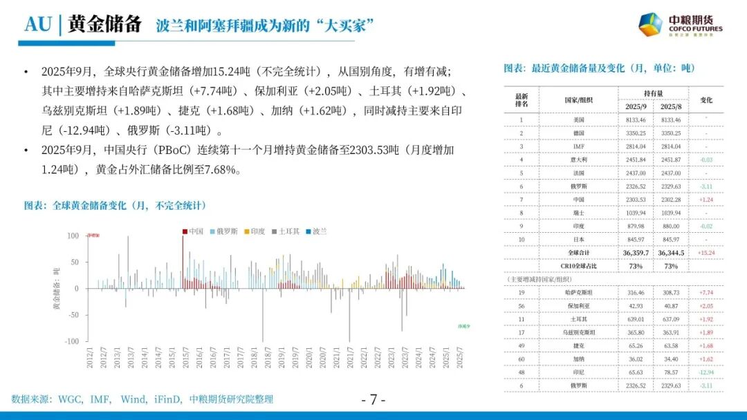 2025年9月,中国央行(PBoC)连续第十一个月增持黄金储备至2303.53吨(月度增加1.24吨),黄金占外汇储备比例至7.68%。