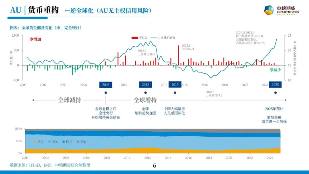 在逆全球化背景下,各国为降低美元在外汇储备中的占比,持续增持黄金,导致黄金作为外汇储备的占比自2023年起持续提升,美元储备占比则持续下降。