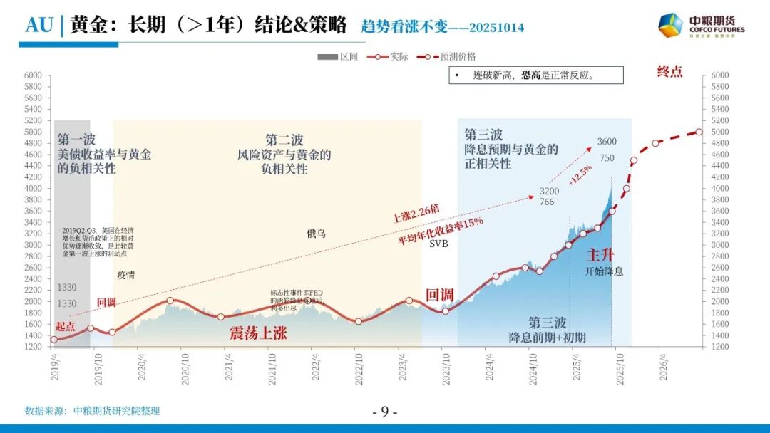 黄金上涨最早源于美联储9月降息预期的炒作,预期证实后市场开始焦虑11月、12月是否继续降息,年底还将关注2026年降息幅度;这一趋势预计从2025年8月底持续至12月,甚至2026年一季度。