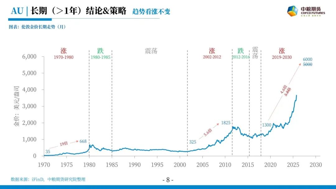 上调长期(至2030年)黄金价格高点预期,从原来的5000美元/盎司上调至6000美元/盎司,涨幅从3.8倍调整为4.6倍(以2019年为起点计算)。