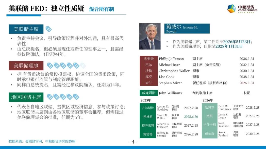 地方联储票委共5票,其中纽约联储主席为长期票委,其他4位地方联储票委每年轮值(2025年的4位票委到2026年将不再是票委),所以不仅要关注2025年票委的观点主张,也要关注2026年票委的观点主张。同时,特朗普对美联储理事的人事任免权较强(需总统提名并经参议院确认),对地方联储(如纽约联储主席为长期票委,其他地方联储票委轮值)的掌控力较弱,因美国联邦制下地方人事任免权较小。